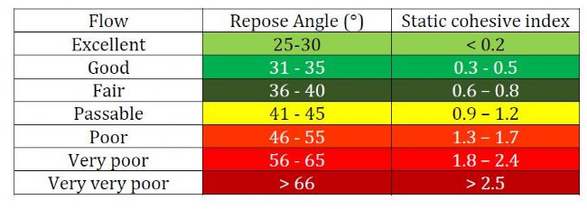 GranuHeap是一種基于對粉體堆形進(jìn)行圖像處理和自動化分析的測量方法。為了獲得高重現(xiàn)性的結(jié)果,Granuheap使用了一個內(nèi)徑等于圓形支架的套管,實驗開始前,套管將被安裝在粉體樣品的托架上。首先,用手將固定體積的粉體(通常為100毫升)填裝到套管后,套管以恒定的速度上升。此時,粉體從管中流出,在圓柱支架上形成粉堆。通過控制托架的旋轉(zhuǎn),可以獲得不同方向上對應(yīng)的粉堆投影。全自動圖像識別算法確定粉體/空氣界面的位置。休止角便是指與粉體堆投影圖像表面積相同的等腰三角形的角度。這個等腰三角形得形狀與粉堆內(nèi)聚力相對應(yīng)。在旋轉(zhuǎn)托盤時,從不同角度來計算每個圖像中粉堆的休止角,然后計算平均值。對于非粘性粉體,該靜態(tài)粘聚指數(shù)接近于零,當(dāng)分體內(nèi)部粘聚力增強(qiáng)時,該靜態(tài)粘聚指數(shù)增大。下表顯示了用GranuHeap得到的結(jié)果與粉體流動性之間的經(jīng)驗關(guān)系。