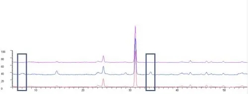 X射線衍射跟蹤圖,法醫(yī)專家可對(duì)圖中不同顏色的曲線進(jìn)行比較分析。紅色曲線來(lái)自從受害人的鞋底收集的土壤樣本,藍(lán)色和粉色曲線分別來(lái)自從兩個(gè)嫌疑人的鞋底收集的土壤樣本。在現(xiàn)場(chǎng)采集的X射線衍射跟蹤圖表明藍(lán)色曲線代表的嫌疑人不在犯罪現(xiàn)場(chǎng),因?yàn)樵?和34度2θ處,藍(lán)色曲線出現(xiàn)了峰值,而在代表受害人的紅色曲線上沒(méi)有出現(xiàn)峰值。