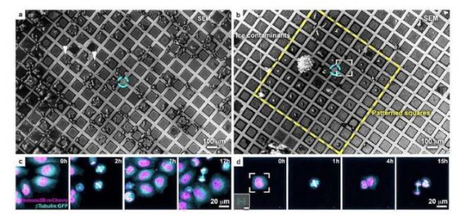記組蛋白(品紅色),分別種植在標(biāo)準(zhǔn)網(wǎng)格中( c 圖)和微圖案化的網(wǎng)格中( d 圖)?梢