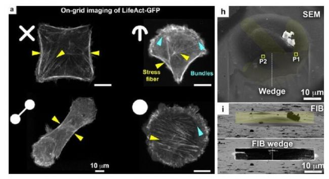 ( h-i 圖):一個(gè)生長在十字弓形狀的微圖案(黃色)上的細(xì)胞的掃描電鏡( SEM)圖,微