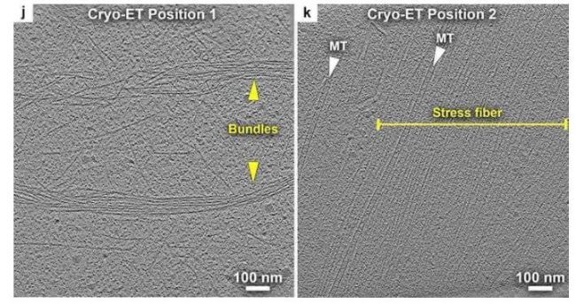 圖 4. ( j-k 圖):冷凍電鏡圖像:分別是(圖 3, h 圖)中 P1 和 P2 兩個(gè)位置的斷層掃描切