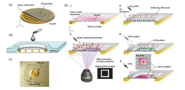 可粘附在蝕刻出的微圖案上,細(xì)胞再粘附在蛋白上。整個(gè)過程對(duì)電鏡網(wǎng)格無損傷。