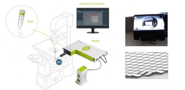 無掩模 UV 投射和蝕刻。 PRIMO 模塊和大多數(shù)倒置顯微鏡兼容。右圖: PRIMO 通過控制 DMD