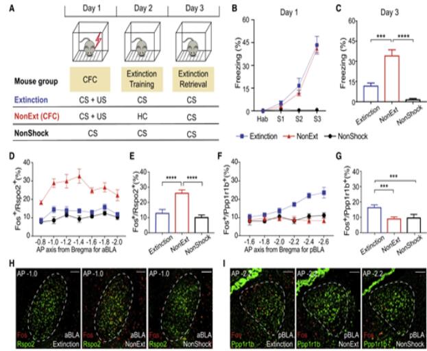 在先前的研究中,Kim發(fā)現(xiàn)表達(dá)Ppp1r1b基因的神經(jīng)元編碼報(bào)酬價(jià),并與編碼負(fù)價(jià)的BLA中不同的表達(dá)Rspo2基因的神經(jīng)元競(jìng)爭(zhēng)。在這項(xiàng)新的研究中,Zhang、Kim和Tonegawa開(kāi)始決定這種競(jìng)爭(zhēng)平衡是否也是恐懼和其消退的根源。