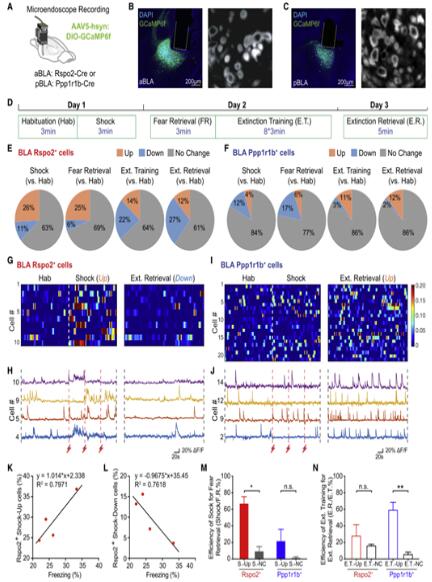 當(dāng)老鼠接受恐懼滅絕訓(xùn)練時(shí),科學(xué)家使用Inscopix超微顯微鈣成像系統(tǒng)觀察了BLA中不同神經(jīng)群的活動(dòng)。他們發(fā)現(xiàn),在經(jīng)歷恐懼消退的小鼠中,Ppp1r1b細(xì)胞更活躍,而Rspo2細(xì)胞則更不活躍。他們還發(fā)現(xiàn),雖然Rspo2細(xì)胞主要被電擊激活,并在恐懼消退時(shí)受到抑制,但Ppp1r1b細(xì)胞在滅絕記憶訓(xùn)練和恢復(fù)過(guò)程中主要活躍,但在休克期間受到抑制。