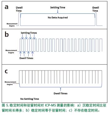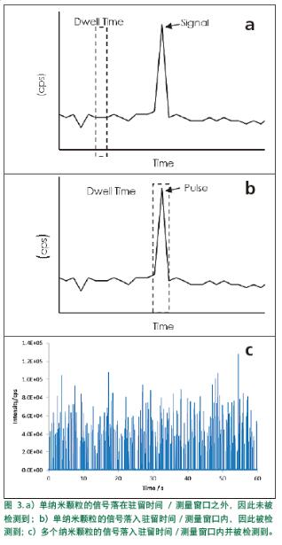 在單顆粒ICP-MS 中,瞬態(tài)數(shù)據(jù)的采集速度由兩個(gè)參數(shù)組成:駐留時(shí)間和穩(wěn)定時(shí)間。十分重要的是,ICP-MS 采集信號(hào)所需的駐留時(shí)間少于顆粒瞬態(tài)時(shí)間,從而避免因部分顆粒合并、顆粒重合和團(tuán)聚/ 聚集產(chǎn)生的錯(cuò)誤信號(hào)。穩(wěn)定時(shí)間越短,顆粒遺漏的可能性就越小。最理想的情況是一秒鐘內(nèi)可進(jìn)行10,000 次測(cè)量,不存在穩(wěn)定時(shí)間,所有時(shí)間皆用于尋找納米顆粒(圖5c)。