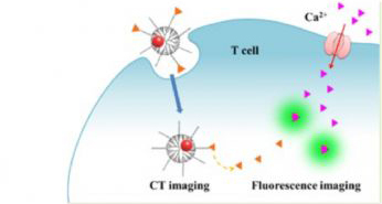 在腫瘤的治療方法中,免疫治療已發(fā)展成為繼手術(shù)、放療和化療之后的第四大治療手段,越來越多受到學(xué)者的關(guān)注。一種基于T細(xì)胞的細(xì)胞免疫療法(ACT) 是成為了其中的熱點(diǎn),主要方法是將體外分離并修飾改造、擴(kuò)增后的患者自身的T細(xì)胞后回輸患者體內(nèi),以激發(fā)自身免疫系統(tǒng)產(chǎn)生對(duì)腫瘤的殺傷能力。然而,在評(píng)估該療法的效果評(píng)價(jià)過程中,怎樣對(duì)T細(xì)胞及其功能進(jìn)行活體實(shí)時(shí)監(jiān)測示蹤仍是一大技術(shù)難題?捎糜诒O(jiān)測和追蹤T細(xì)胞的納米系統(tǒng)為活體評(píng)價(jià)T細(xì)胞免疫治療的功能和療效提供了重要依據(jù)。為此, 東華大學(xué)史向陽團(tuán)隊(duì)設(shè)計(jì)了一種高效的納米探針, 可利用聚胺胺(PAM AM)樹枝狀大分子包埋的金納米粒子(Au-DE NPs) 與Fluo-4結(jié)合并用于計(jì)算機(jī)斷層掃描(CT)和熒光成像雙模態(tài)成像。