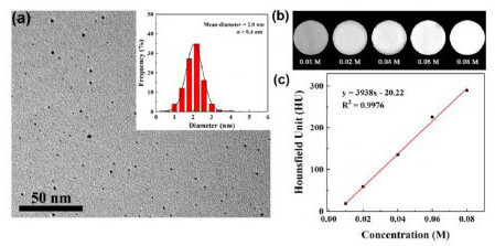 Figure 3.(a) ((AunJ25G 5.NHAc-(PEG] uw-(Fluo 4) ) DE NPs的TEM圖像和金核心尺寸分布立方圖; (b) ((Aum] as-G 5.NHA e-[PEG] u-(Flu a-4) ) DE NPs在不同金濃度下的CT圖像和(c)CT值。