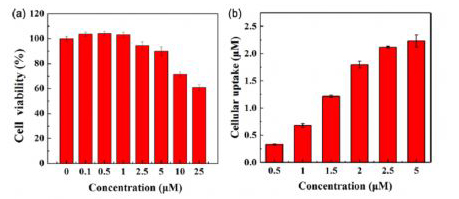 Figure 4.(a) 不同濃度的((Auo] 2s·G 5.NHAc-(PEG] i 4-(Fluo-4) DE NPs處理T細(xì)胞24小時(shí)后用CCK-8分析T細(xì)胞活性;(b) 不同濃度的((Auo] 25-G 5.NHAc·f PEG) is-(Fluo-4) 4)DE NPs處理T細(xì)胞4小時(shí)后細(xì)睢內(nèi)的金含量。