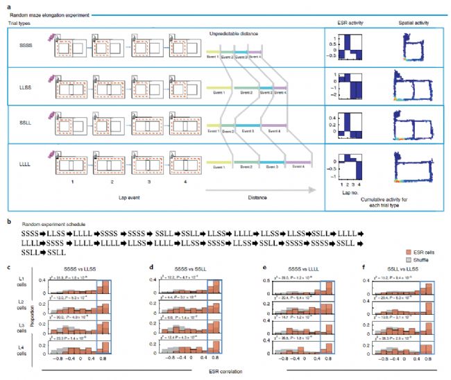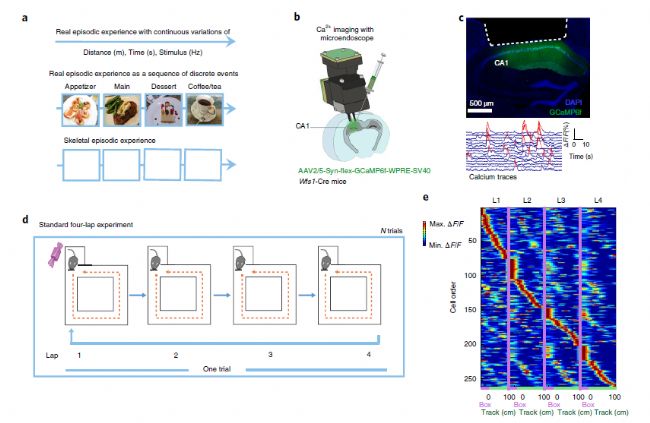 為了排除這個記憶經(jīng)驗(yàn)可能和時間或空間具有相關(guān)性,研究人員通過對方形迷宮的加長,設(shè)計出來了S(短距離)和L(長距離)圈的隨機(jī)組合(圖2b),在不改變動物每次試驗(yàn)的第1圈開始時,會獲得獎勵,隨后的三圈不給獎勵這樣的行為范式,繼續(xù)使用小顯微鏡顯微鏡記錄海馬區(qū)神經(jīng)元的變化(圖2a),發(fā)現(xiàn)這種跑圈的經(jīng)驗(yàn)是把每1圈當(dāng)中獨(dú)立經(jīng)驗(yàn)完成的,這個經(jīng)驗(yàn)不受當(dāng)前或鄰近圈(事件)內(nèi)時空變化的影響(圖2c)。