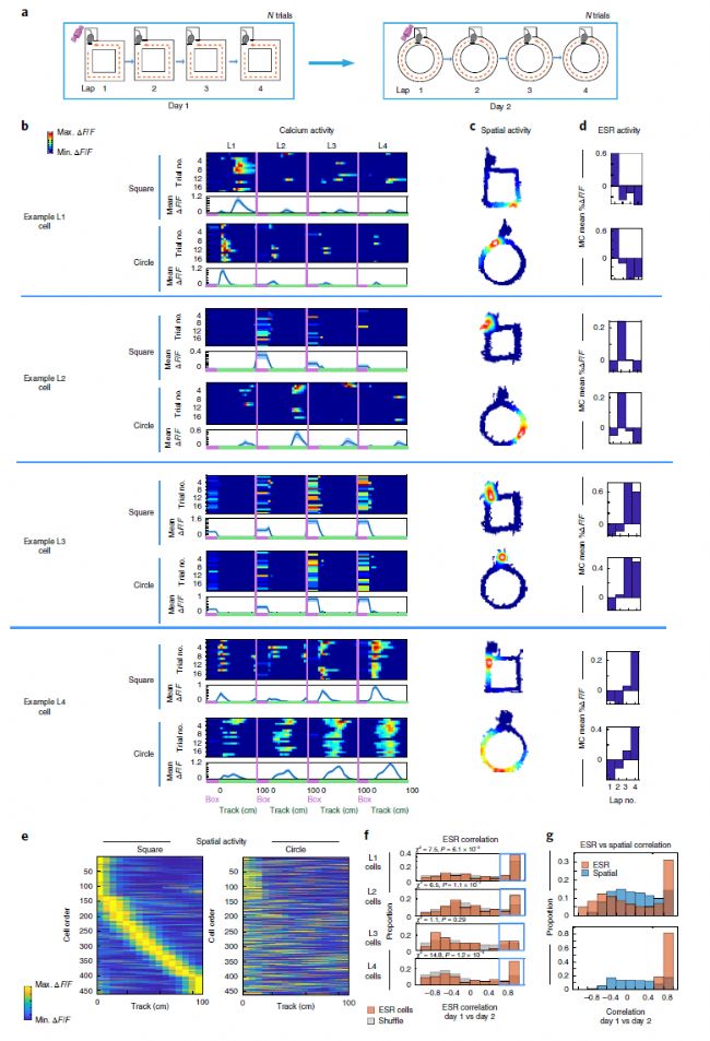 更進(jìn)一步的,研究人員訓(xùn)練小鼠在第1天跑方形的圈,而第2天跑圓形的圈(圖3a),在行為獎勵范式不變的情況下,他們發(fā)現(xiàn)位置細(xì)胞活躍區(qū)域的變化,小鼠在新的環(huán)境中位置細(xì)胞會在不同的位置發(fā)放。然而,不管小鼠跑圈的形狀如何改變,在這4圈中的每1圈里面都會有相同的與圈有特異性關(guān)系的細(xì)胞被激活(圖3b)。