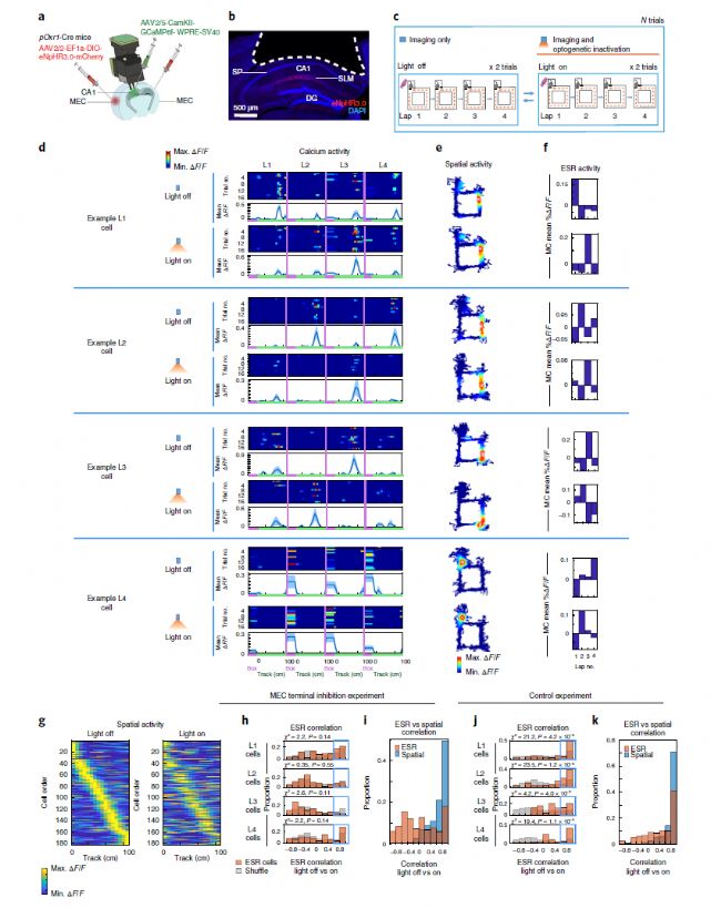 接下來,研究人員將表達(dá)抑制性視蛋白的病毒(AAV2/2-EF1a-DIO-eNpHR3.0-mCherry)注射到pOxr1-Cre小鼠的大腦內(nèi)側(cè)內(nèi)嗅皮層(MEC)亞區(qū),用光遺傳方法抑制了來自MEC的感覺輸入(圖4a)(編者注:MEC的輸入在之前的研究中表明其與經(jīng)驗(yàn)的順序組織有關(guān)),仍然使用小顯微鏡記錄MEC軸突終末的dCA1神經(jīng)元,通過28-40次跑四圈任務(wù)的試驗(yàn),這些試驗(yàn)在MEC軸突終末的光遺傳失活(點(diǎn)亮)和不失活(點(diǎn)亮)之間交替進(jìn)行。dCA1中MEC末端的失活沒有改變dCA1中的空間活動模式(圖4g, i),然而,這種失活改變了同一細(xì)胞中的跑圈編碼的活動模式(圖4h, i)。相比之下,注射AAV2/2-EF1a-DIO-mCherry(也就是說,沒有eNpHR3.0來抑制視蛋白)的對照組小鼠在啟動和關(guān)閉試驗(yàn)中保留了跑圈的活動模式(圖4j, k)。這也就說明了跑圈的特定活動模式可以與空間活動相互獨(dú)立地操作,盡管這兩個活動模式在同一個細(xì)胞中聯(lián)合表達(dá)。