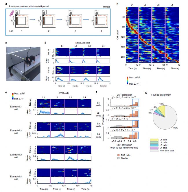 最后,研究人員繼續(xù)探究了經(jīng)驗(yàn)在空間不變的情況下會發(fā)生什么?為了回答這個問題,研究人員用跑步機(jī)(滔博生物傾情提供)代替了標(biāo)準(zhǔn)的迷宮(圖5a, c),進(jìn)行了4次跑步,每次小鼠以14cm/s的速度在跑步機(jī)上跑12s,再次通過使用小顯微鏡記錄CA1神經(jīng)元發(fā)現(xiàn)跑圈的特定活動模式仍然出現(xiàn)(圖5e,f),表明海馬神經(jīng)元對經(jīng)驗(yàn)的調(diào)用與事件特定特征以及連續(xù)變量跟蹤表征一起以一種聯(lián)合的方式發(fā)生,即使在空間不變的情況下也是如此。