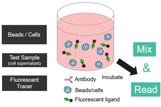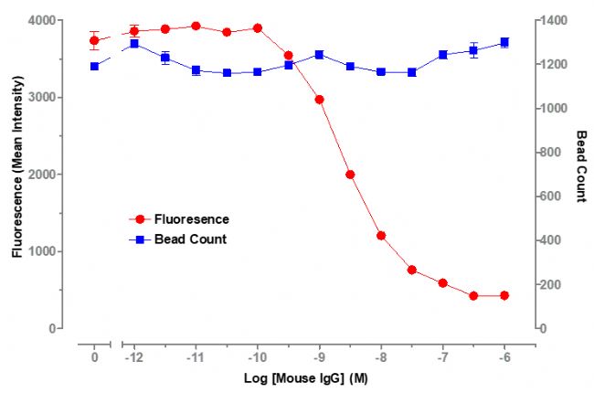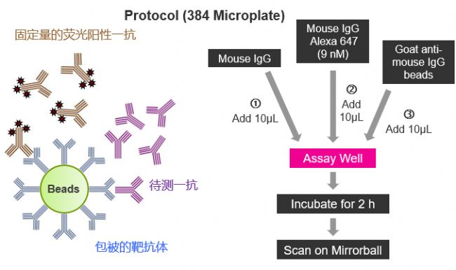 4. 競爭結(jié)合實驗:mirrorball上還可以實現(xiàn)免洗競爭結(jié)合實驗。例如 類似于競爭性ELISA。步驟很簡單,在微珠上包被二抗,然后加入固定量的熒光標記一抗和待檢測的一抗,混合在一起,孵育一段時間,讀板獲取分析數(shù)據(jù),并獲得相應的IC50。