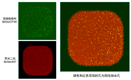 其次,用活細胞染料如Dio或CFSE標記細胞,加入待測的一抗以及相應的紅色熒光二抗如Alexa647,同時能檢測到綠色和紅色信號的細胞即為陽性結(jié)合,紅和綠的共定位,在儀器中顯示為黃色信號,從而排除背景的熒光二抗。