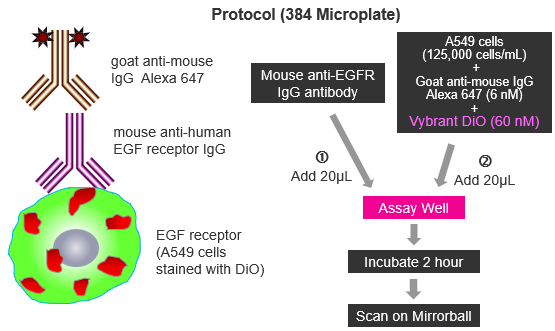 1. 針對細胞表面抗原的抗體篩選:這是mirrorball最常見也是最廣泛的應用。例如在感興趣靶點的細胞上,加入待測的一抗如雜交瘤上清、細胞染料和熒光檢測二抗,中間無需任何洗滌過程,孵育1-2小時后直接讀板檢測,同時有細胞和熒光二抗共定位信號的孔即為陽性結(jié)合孔。