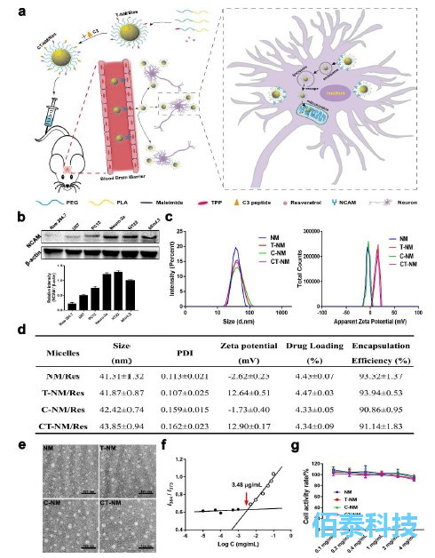 Figure 1.(a)使用NCAM模擬肽C3和TPP共修飾膠束用于逆轉(zhuǎn)線粒體功能障礙的模擬圖;(b)NCAM在不同細(xì)胞系中的表達(dá);(c)未修飾以及C3或者配合TPP單獨(dú)修飾后的膠束和兩者同時(shí)修飾后的膠束的尺寸分布和電動(dòng)電勢;(d)不同的白藜蘆醇包載的膠束的特征;(e)四種不同膠束的電鏡圖像;(f)CT-NM的臨界膠束濃度;(g)四種膠束和神經(jīng)細(xì)胞HT22在37℃孵育48h,得到體外毒性數(shù)據(jù);