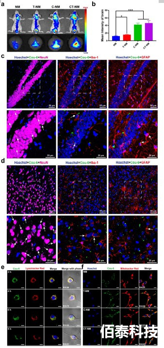 Figure 2.具有神經(jīng)細(xì)胞線粒體靶向的CT-NM;铙w注射NM/DiR,T-NM/DiR,C-NM/DiR,以及CT-NM/DiR后一小時(shí)的活體成像圖(a)和腦部的平均熒光強(qiáng)度(b);在APP/PS1轉(zhuǎn)基因小鼠皮下注射CT-NM/Cou-6(0.5mg Cou-6/kg)后使用激光共聚焦顯示CT-NM在海馬(c)和皮質(zhì)(d)中的分布;(e)不同時(shí)間培養(yǎng)后Cou-6負(fù)載的CT-NM在Neuro-2a中的熒光分布圖;(f)8h培養(yǎng)后的不同的Cou-6負(fù)載的膠束在Neuro-2a中的熒光分布;