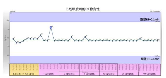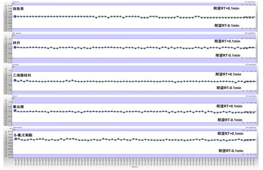 圖11.蘋果基質(zhì)標液(20μg/L)連續(xù)進80針代表性物質(zhì)的RT穩(wěn)定性