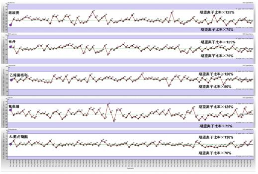 圖12. 蘋果基質(zhì)標液(20μg/L)連續(xù)進80針代表性物質(zhì)的離子比率穩(wěn)定性