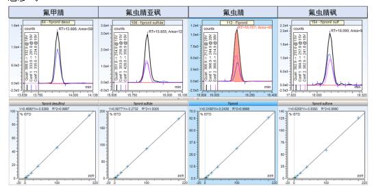 另外,聽說你對氟蟲腈有點頭疼?下面額外展示了本解決方案中氟蟲腈、氟甲腈、氟蟲腈砜、氟蟲腈亞砜的基質(zhì)標液(1μg/L)以及1-200 μg/L的線性范圍,供您參考。