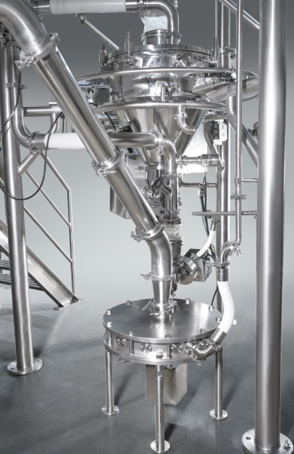 通過錐型的緩沖料倉設(shè)計(jì)添加振動(dòng)裝置,根據(jù)原料藥的流動(dòng)性,設(shè)置不同的振動(dòng)頻率及振動(dòng)時(shí)間,達(dá)到在大型生產(chǎn)的過程中連續(xù)穩(wěn)定進(jìn)料的目的。大型生產(chǎn)中多種投料方式可選:人工投料、真空上料機(jī)、料倉重力進(jìn)料、提升料倉分體蝶閥對(duì)接。