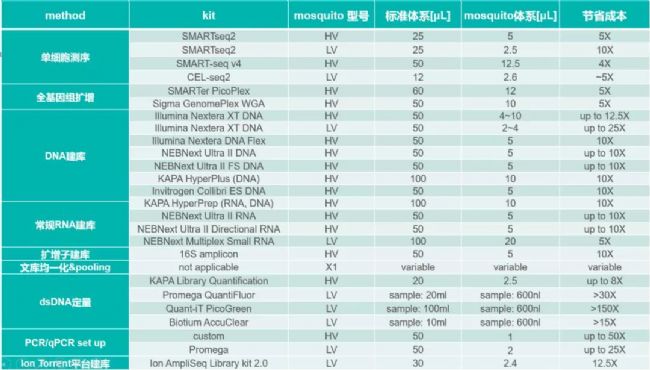 除了常規(guī)的測(cè)序外,mosquito和dragonfly還廣泛應(yīng)用于單細(xì)胞轉(zhuǎn)錄組、宏基因組和表觀組測(cè)序等多個(gè)應(yīng)用,涉及到數(shù)十個(gè)成熟的protocol。通過(guò)mosquito和dragonfly,可以大大降低input的使用量 (20 pg),微縮化整個(gè)建庫(kù)體系(低至2 uL),大大節(jié)省試劑和耗材成本,提高整個(gè)工作流程的精準(zhǔn)度和自動(dòng)化。