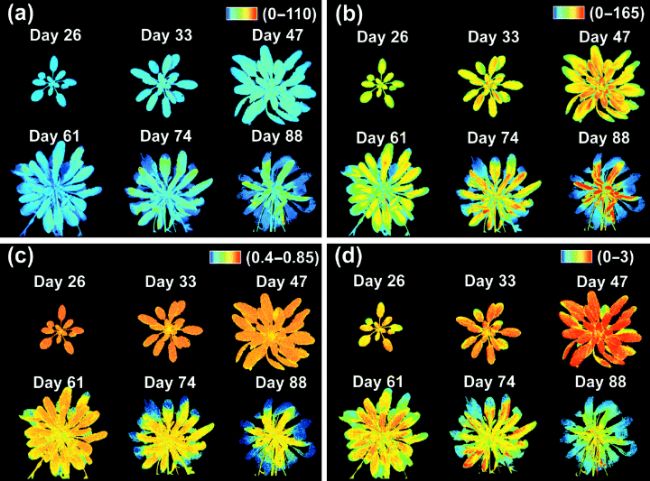 倫敦大學(xué)學(xué)院生物學(xué)系使用FluorCam葉綠素?zé)晒獬上裣到y(tǒng)研究擬南芥衰老過(guò)程中的光合生理變化(a-d分別是F0、Fm、Fv/Fm和NPQ的成像圖)。