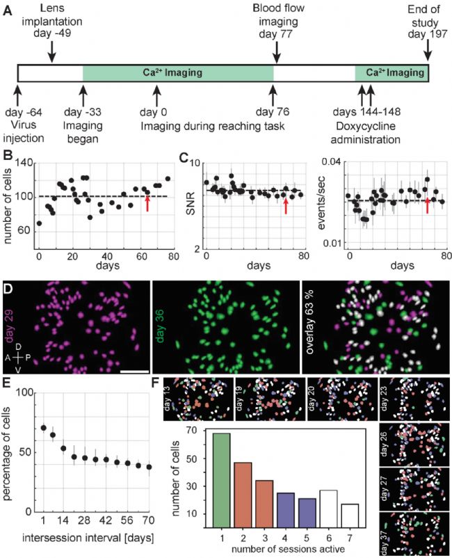 研究人員在不到8個(gè)月中一共進(jìn)行了66次成像記錄,在開始4個(gè)月中連續(xù)進(jìn)行了42次記錄(圖2A),之后暫停。動(dòng)物全身注射熒光染料以進(jìn)行鎮(zhèn)靜血流成像,經(jīng)一個(gè)月后,恢復(fù)了鈣活動(dòng)成像,但血液熒光染料完全干擾了檢測(cè)GCaMP熒光信號(hào)的能力。研究人員在第6個(gè)月繼續(xù)進(jìn)行鈣成像,測(cè)試Dox給藥對(duì)測(cè)得的鈣活動(dòng)的影響。從第0天到第76天的32個(gè)成像階段中(圖2A),結(jié)果令人滿意,總體成像質(zhì)量和鈣活動(dòng)保持穩(wěn)定(圖2B-C)。左半球PMd中識(shí)別出的細(xì)胞數(shù)在間隔的記錄之間波動(dòng),但總體相對(duì)穩(wěn)定,記錄細(xì)胞中位數(shù)為104個(gè) [四分位數(shù)IQR 91-113] (圖2B)。信噪比和檢出鈣事件率在各試驗(yàn)記錄中也是相對(duì)穩(wěn)定的,在右半球PMd的成像細(xì)胞中也觀察到了相似的穩(wěn)定性(圖2C)。