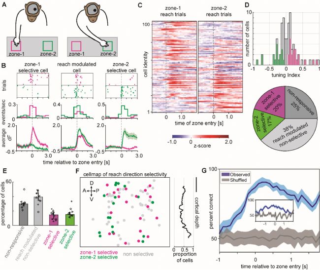 接下來,研究人員將神經(jīng)元的鈣離子活動(dòng)與動(dòng)物動(dòng)作進(jìn)行直接關(guān)聯(lián)。首先訓(xùn)練動(dòng)物的伸手動(dòng)作,在動(dòng)物面前有左右兩個(gè)位置,隨機(jī)交替放置食物獎(jiǎng)勵(lì),動(dòng)物伸手取食(圖3A)。根據(jù)先前的電生理實(shí)驗(yàn)研究,預(yù)期是在動(dòng)物伸出左手或右手時(shí),其神經(jīng)元活動(dòng)對(duì)其伸手方向有選擇性活躍,對(duì)側(cè)手臂活動(dòng)對(duì)神經(jīng)活動(dòng)有響應(yīng)。實(shí)驗(yàn)結(jié)果證實(shí)了期望,在圖表展示的左半球記錄中,動(dòng)物正用右臂伸手,幾個(gè)神經(jīng)元在向區(qū)域1和區(qū)域2伸手期間,鈣離子活動(dòng)均有增加且發(fā)生鈣事件的可能性更高,其他細(xì)胞則表現(xiàn)出對(duì)伸手到區(qū)域1相比區(qū)域2有更多的鈣活動(dòng),反之亦然。圖表的三個(gè)示例清楚地展示了神經(jīng)元獨(dú)特的選擇傾向(圖3B),無論是鈣事件還是在鈣離子活動(dòng)變化上。