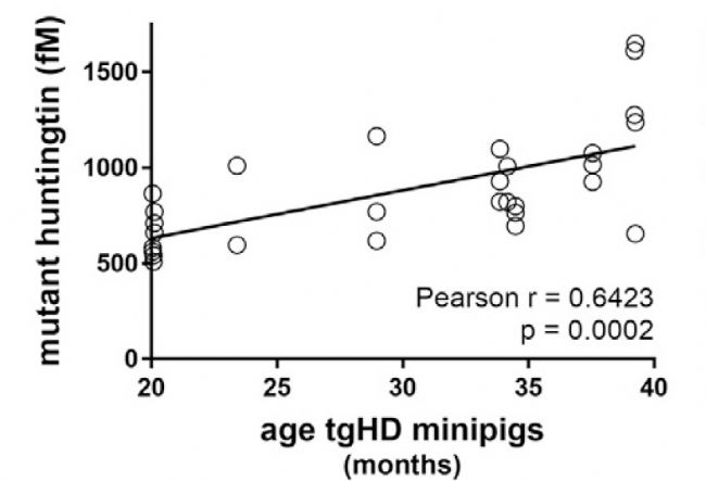 圖:SMC™超敏技術(shù)對(duì)不同年齡tgHD小型豬腦脊液中mHTT蛋白進(jìn)行檢測(cè),年齡與mHTT水平呈正相關(guān)(Molecular Therapy,2018)