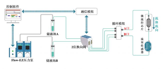 此系統(tǒng)中,通過調(diào)節(jié)壓力泵驅(qū)動(dòng)流體的方向與時(shí)間,結(jié)合閥門控制,實(shí)現(xiàn)了流體循環(huán),同時(shí)也保證了流體在微流控芯片中以同一方向流動(dòng)。