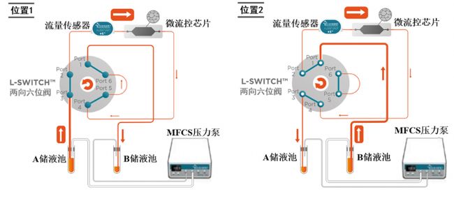 位置1:MFCS壓力泵將A儲(chǔ)液池中的流體泵出,依次經(jīng)過L-Switch的port 3和port 2、流量傳感器、微流控芯片,然后再經(jīng)過L-Switch的port4、port5和port6、port1,最后再流至B儲(chǔ)液池中。