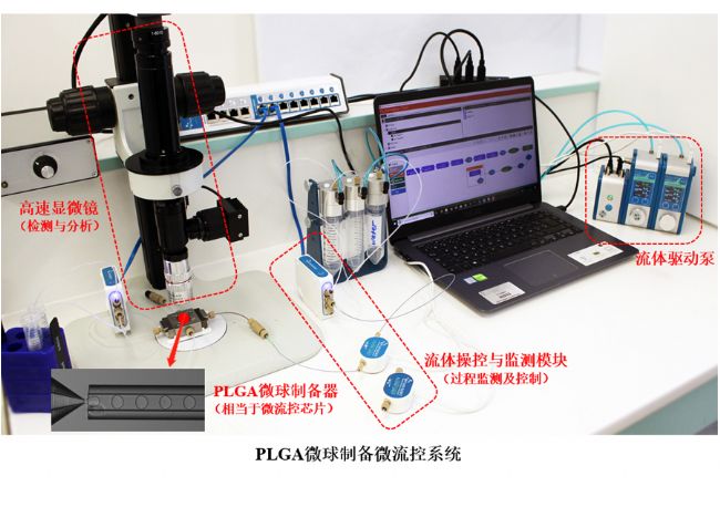 下圖為PLGA(聚乳酸-羥基乙酸共聚物)微球制備微流控系統(tǒng)的實物連接圖,可輔助理解微流控系統(tǒng)的概念。