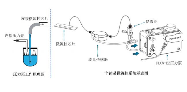 下圖展示了FLOW-EZ壓力泵工作原理和一個簡易微流控系統(tǒng)示意圖。