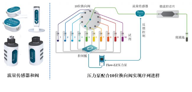 在此子系統(tǒng)中,即可實現(xiàn)流量的反饋控制,同時,結(jié)合閥門控制,也能實現(xiàn)流體的序列進樣、循環(huán)進樣和體積定量等多種流體操控,實例可參考下圖。