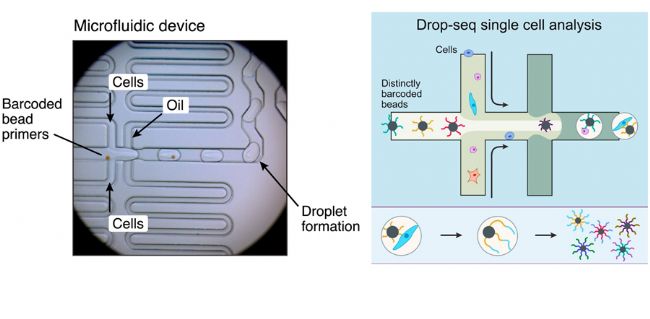 細(xì)胞是生物結(jié)構(gòu)與功能的基本單位,形態(tài)類型千差萬別。通過細(xì)胞基因組學(xué),可以描述細(xì)胞特性及功能,本文所介紹的單細(xì)胞(single-cell)高通量液滴測(cè)序(Drop-seq)技術(shù),是一種快速分析成千上萬個(gè)單細(xì)胞的方法,通過將每個(gè)細(xì)胞包裹在納升級(jí)微滴中,進(jìn)行RNA雜交并生成mRNA轉(zhuǎn)錄物,制作細(xì)胞基因表達(dá)譜,進(jìn)一步可分析mRNA轉(zhuǎn)錄物的起源細(xì)胞。
