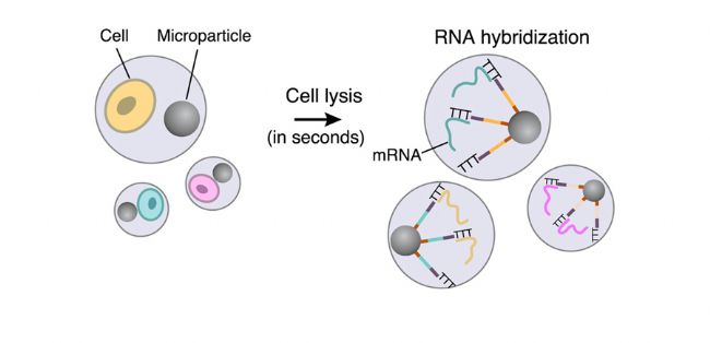3.RNA雜交:裂解微滴中的細(xì)胞,細(xì)胞釋放mRNA,與微珠上的分子條形碼雜交。
