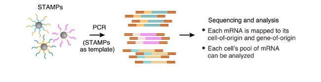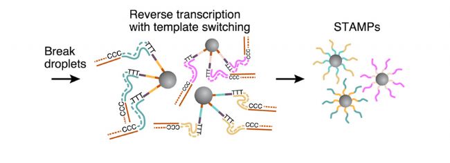 4.逆轉(zhuǎn)錄:裂解微滴,釋放mRNA雜交物,開始逆轉(zhuǎn)錄,以形成mRNA逆轉(zhuǎn)錄物(STAMPS)。