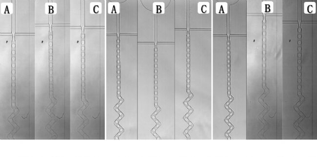 上圖中,左、中、右三圖分別為使用實(shí)驗(yàn)組1、對(duì)比組1和對(duì)比組2三種表面活性劑的液滴生成圖。A、B、C分別表示表面活性劑的濃度為0.5%、2%和5%。