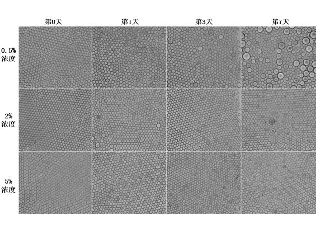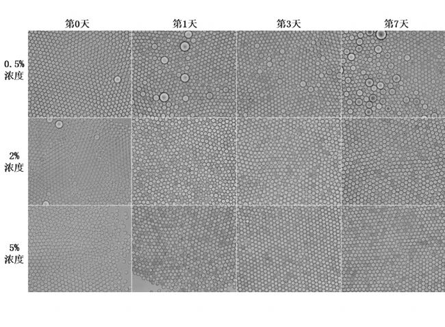 在對(duì)微生物培養(yǎng)的第0,1,3和7天,觀察使用3種表面活性劑在不同濃度下所制備的液滴,獲取數(shù)據(jù)見(jiàn)下。