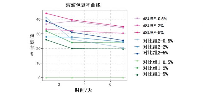 上圖中,可觀察到使用dSruf表面活性劑制備的液滴,液滴包裹率最高,在對(duì)液滴中微生物培養(yǎng)7天后,包裹率仍在30%以上。對(duì)比組1包裹率最低,尤其當(dāng)對(duì)比組1中所用表面活性劑濃度為0.5%時(shí),液滴乳化失敗,微生物培養(yǎng)失敗,包裹率為0。