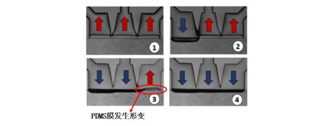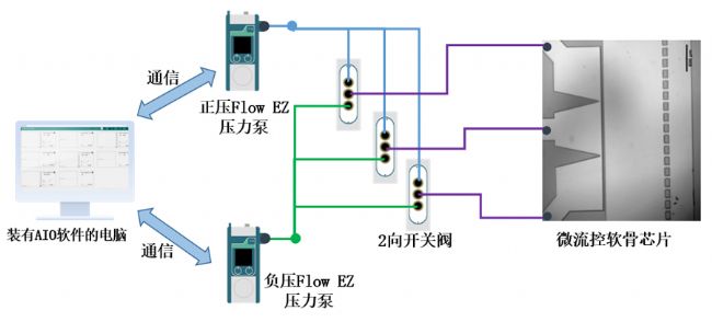 系統(tǒng)采用正壓FlowEZ壓力泵或負(fù)壓Flow EZ壓力泵作為驅(qū)動源,以對芯片上的3個驅(qū)動腔施加正壓和負(fù)壓,并采用3個2向開關(guān)閥來實現(xiàn)正負(fù)壓的切換,其操作流程由PC端軟件進(jìn)行自動化編程控制。在芯片端,采用顯微鏡觀察并分析芯片上PDMS彈性膜的形變,以及軟骨細(xì)胞培養(yǎng)形態(tài)。