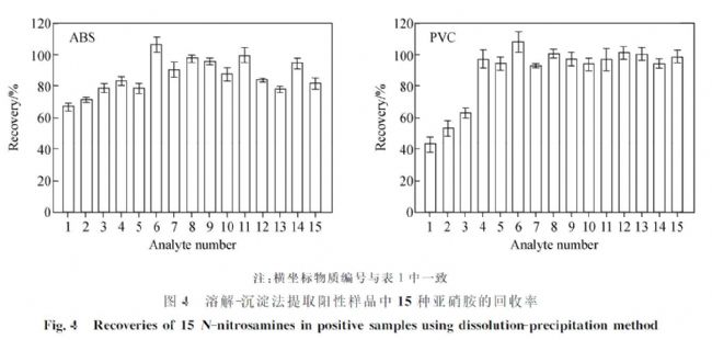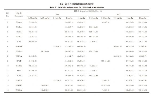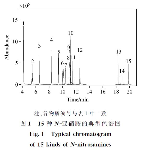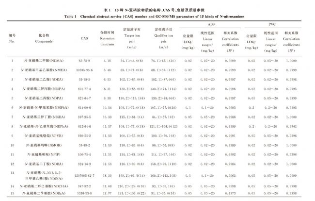 ABS陽性樣品:稱取5g空白樣品至三角瓶中,先加入15mL丙酮,再加入2mL 50mg/L的15種N-亞硝胺的丙酮混合標(biāo)準(zhǔn)溶液,不斷攪拌,然后加入3mL丙酮,繼續(xù)攪拌至塑料樣品恰好完全溶解,混合均勻,將溶液平鋪在大表面皿中,置于通風(fēng)櫥內(nèi)自然風(fēng)干,得到N-亞硝胺含量為20mg/kg的ABS陽性樣品。