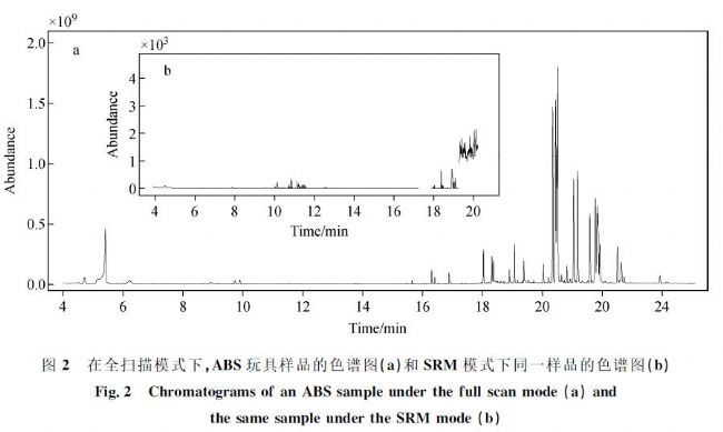 將玩具樣品使用液氮冷凍研磨機(jī)(SPEX 6875 Freeze Mill)粉碎至粒徑小于1mm,稱取0.1g樣品于10mL具塞玻璃瓶中,加入3mL溶劑(向ABS樣品中加入丙酮,向PVC樣品中加入四氫呋喃)后,超聲2min,使樣品充分溶解,然后緩慢加入7mL甲醇,使塑料基質(zhì)完全沉淀,在4℃下,以13000r/min離心5min,取上層清液,經(jīng)0.22μm濾膜過濾,上機(jī)測定。