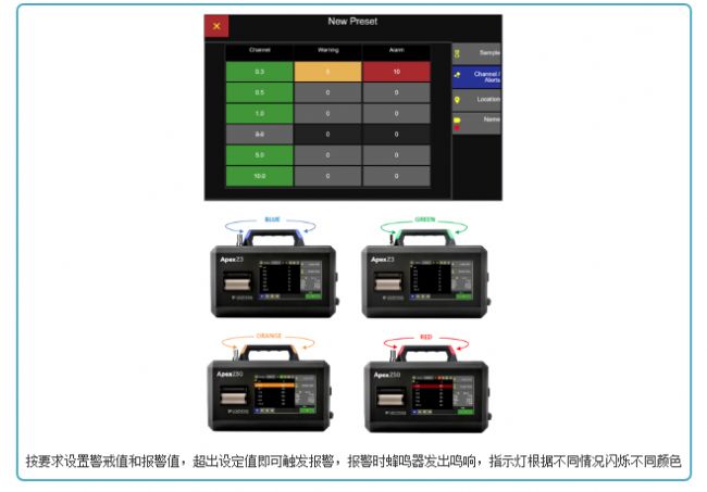 - 可設(shè)置警報,根據(jù)不同情況設(shè)置不同的警戒值和報警值