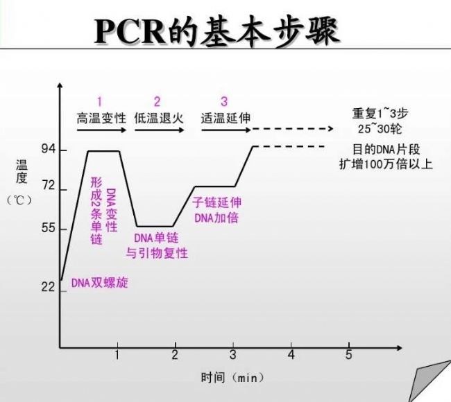 PCR又稱聚合酶鏈反應(yīng),是體外擴增目的DNA片段的方法,在多方面廣泛應(yīng)用,主要分為三大步驟:高溫變性、低溫退火、適溫延伸。分別添加引物、模板、Taq酶、dNTP和緩沖液等反應(yīng)物混合,在約為95℃環(huán)境下,雙鏈DNA氫鍵斷裂解旋為單鏈;單鏈與人工設(shè)計的引物在約為60℃溫度下,按照堿基互補配對的原則相結(jié)合;并升溫到72℃左右,利用Taq酶延伸合成一條新的與模板DNA鏈互補的半保留復(fù)制鏈。