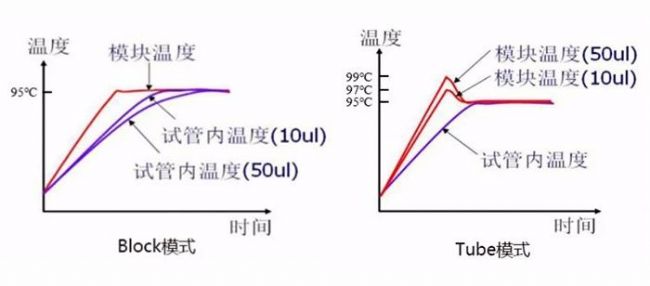 另外,很多PCR儀在加熱模式上有Tube、Block兩種方式可選。這是因為儀器的溫度傳感器在模塊下部,實際上無法測得樣品管內(nèi)的溫度。一般情況(Block)下,在輸入設(shè)定溫度及運行時間時,指的是模塊在到達指定溫度下持續(xù)相應(yīng)的時間,樣品管的溫度不能迅速達到指定的溫度;而Tube模式是先將模塊溫度高于設(shè)定溫度,等樣品管溫度到達指定溫度,再將模塊溫度降到指定溫度,這樣能快速使管內(nèi)溫度達到設(shè)定值。不同反應(yīng)體積和要求可使用不同的模式:普通PCR或體積較大使用Tube模式,當(dāng)長時間保溫且對溫度過沖要求較高或是體積較小時,可以使用Block模式。
