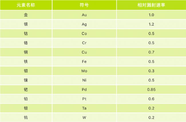 表1. 不同靶材的相對(duì)濺射速率(金靶為1)