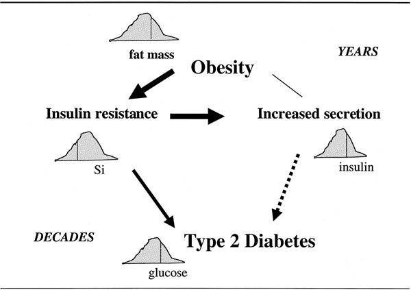研究表明,腹部脂肪會導(dǎo)致脂肪細胞釋放“促炎性”化學(xué)物質(zhì),從而破壞機體對胰島素反應(yīng)性細胞的功能及其對胰島素的反應(yīng)能力,從而使人體對其產(chǎn)生的胰島素的敏感性降低。這就是所謂的胰島素抵抗-II型糖尿病的標(biāo)志。肥胖也被認(rèn)為可以觸發(fā)人體新陳代謝的變化。這些變化會導(dǎo)致脂肪組織向血液中釋放脂肪分子,從而影響胰島素反應(yīng)性細胞并降低胰島素敏感性?茖W(xué)家提出的另一種有關(guān)肥胖如何導(dǎo)致II型糖尿病的理論是,肥胖會導(dǎo)致形成糖尿病前期,這是一種代謝病,幾乎總是會發(fā)展成II型糖尿病。